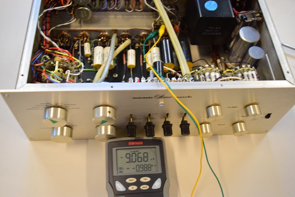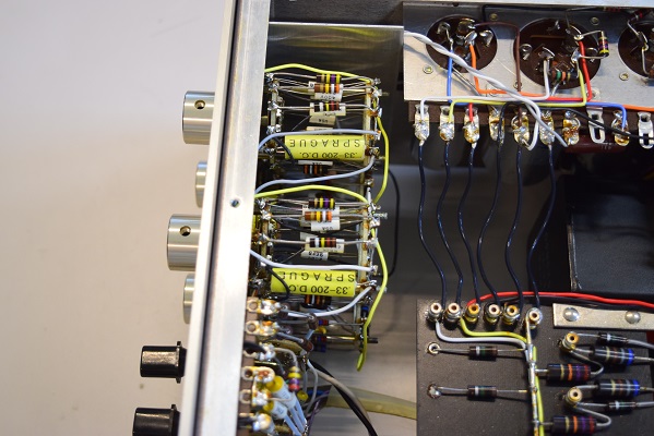 裏面です。こちらのカップリングはMarantz7オリジナル後期純正のGoodAll-TRWの新品を使いました。トーン回路後のカップリングもオリジナル10500〜12000番台に使用される黄色のSPRAGUE NOS品に交換しました。低音の解像度が違います。