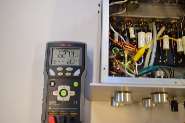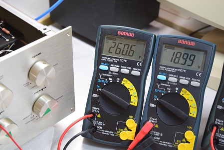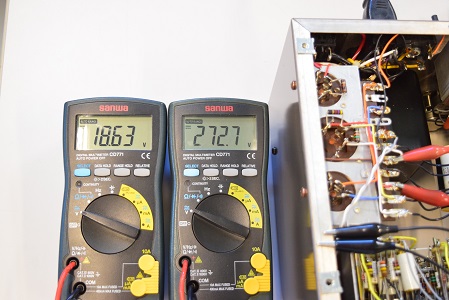 左テスターはヒーター電圧です。18.63Vで良好です。右テスターは高圧B1です。272.7Vで良好です。