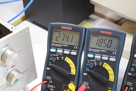 左テスターは高圧B1です。 274.1Vで良い値です。右テスターはヒーター電圧です。 18.50Vで良い値です。
