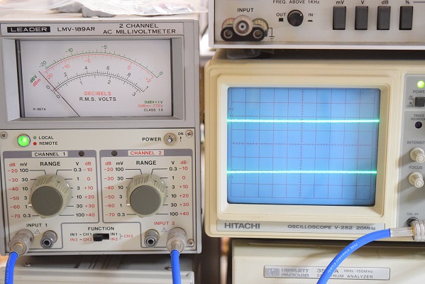 こちらは残留ノイズです。ミリバルのメーター読みで左右とも 0.0001V以下と極めて良い状態です。波形も最小レンジでこの静けさです。こちらで使用するカップリングコンデンサー黒いUSA仕様はここまで良いSNになります。