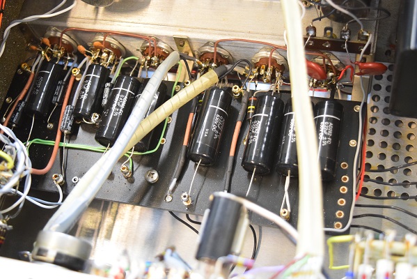 ラインアンプ最終カソードフォロア後のコンデンサーが大盛りの俵積みになっています。危ない状態です。