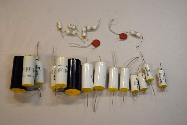 交換部品です。怪しい俵積みを撤去し、殆どのカップリングコンデンサーを交換しました。