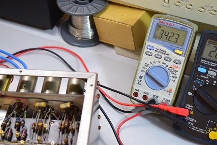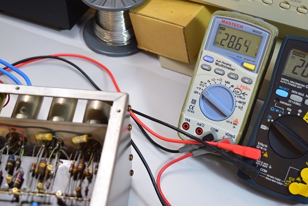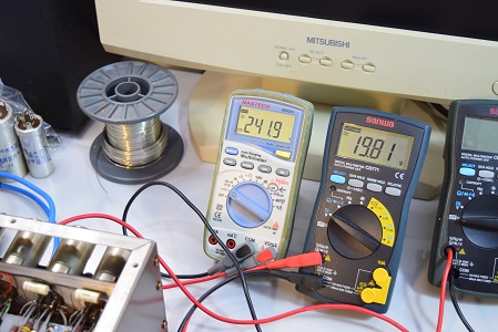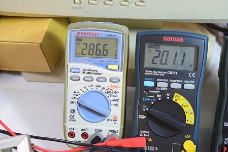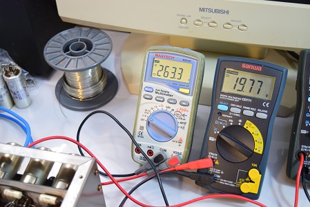 左の白いテスターは高圧B1です。286.0Vで良好です。右テスターはヒーター電圧です。19.99Vで良好です。