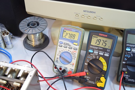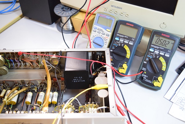左テスターは高圧B1です。286.6Vで良好です。右テスターはヒーター電圧です。20.11Vで少し高いですが良好です。
