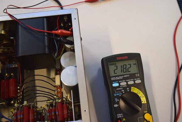 中央のテスターはヒーター電圧です。17.91Vを示し良好です。この後もう少し上がります。右テスターは高圧B1です。278.1Vで良好です。