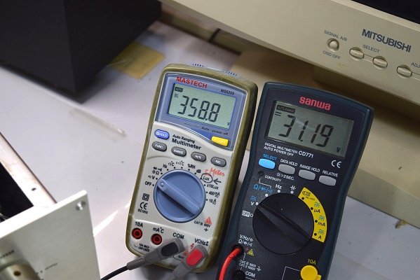 こちらの左テスターは高圧整流ダイオード直後です。正常値です。この為、ダイオードや電源トランスは正常なようです。