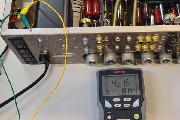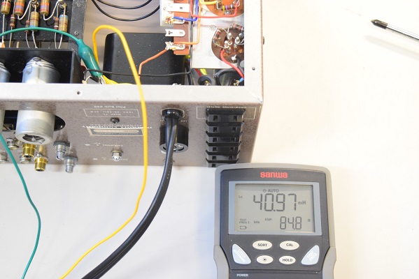 まずは電源トランス1次側のインダクタンスを計ります。 正常なようです。