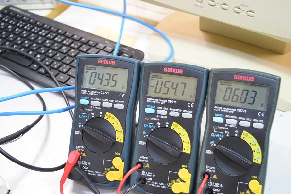 左から高圧B1です。 435Vを示し規定通り大変良い値です。中央はバイアス電圧です。こちらも-54.7Vと極めて良い値です。右はヒーター電圧です。