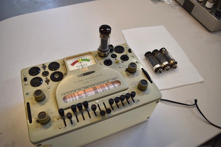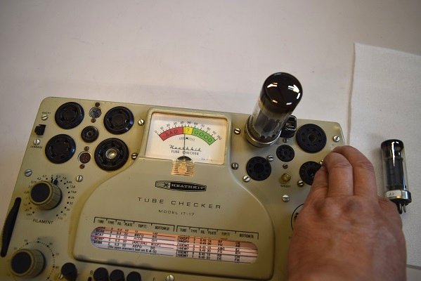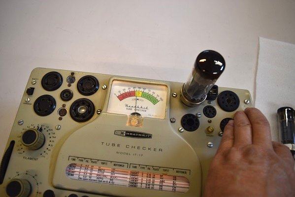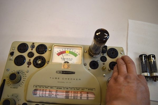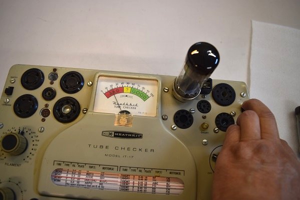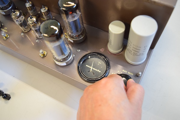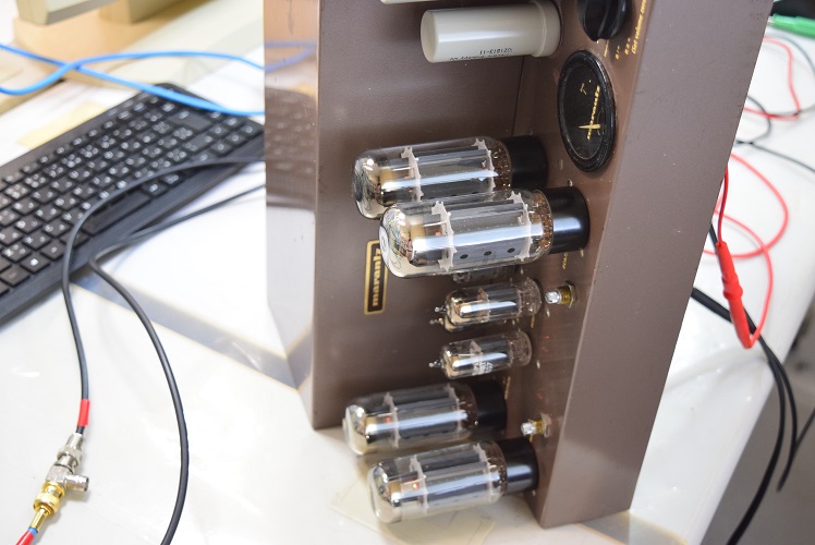 本機の元々付いている出力管は4本とも廃棄値です。 いつも良品はメーターのグリーンの範囲の中央以上を指しています。