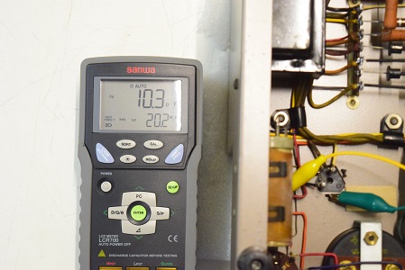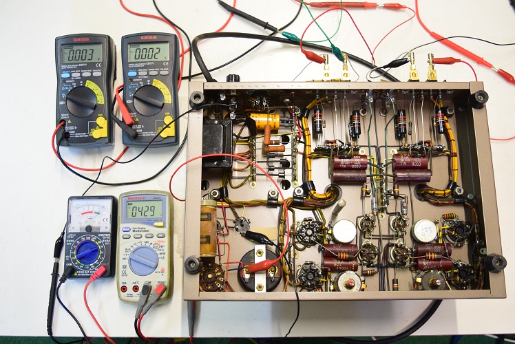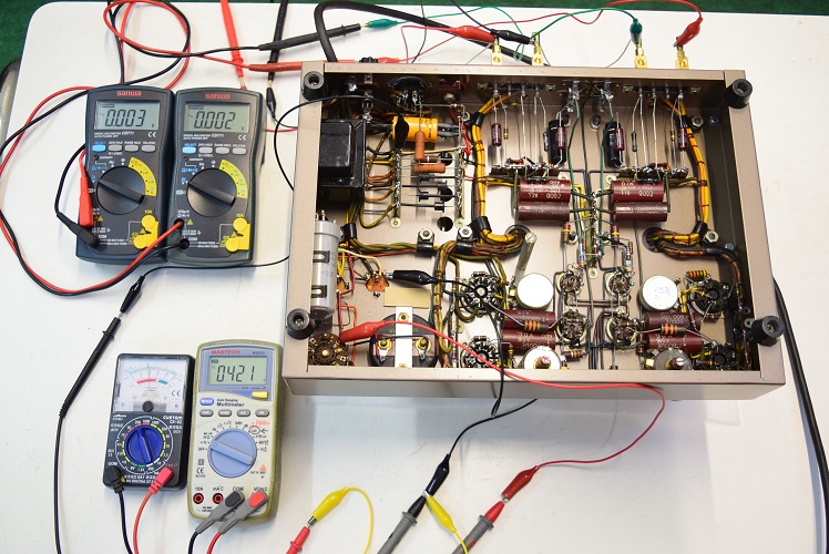 各テスターは左上2台が左右の出力の残留ノイズです。左下のアナログテスターはバイアスC電圧、白いデジタルテスターは高圧B電圧です。