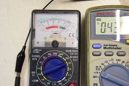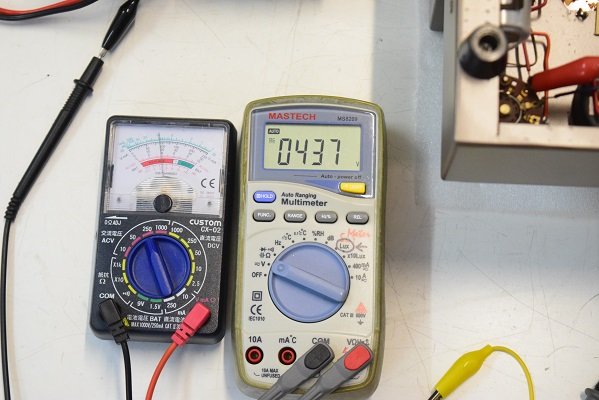 左のアナログテスターはバイアスC電圧です。 -46Vを示し良好です。右の白いデジタルテスターは高圧B電圧です。 437Vを示し良好です。