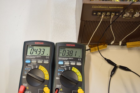 左テスターは高圧B1です。 433Vを示し良い値です。右テスターはバイアスC電圧です。 -38.1Vで少し浅いようです。