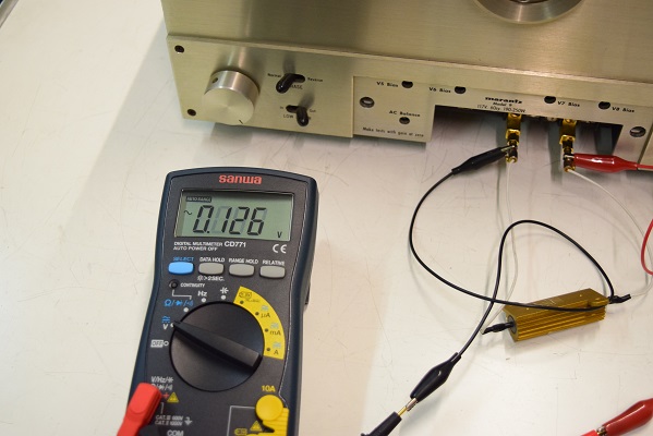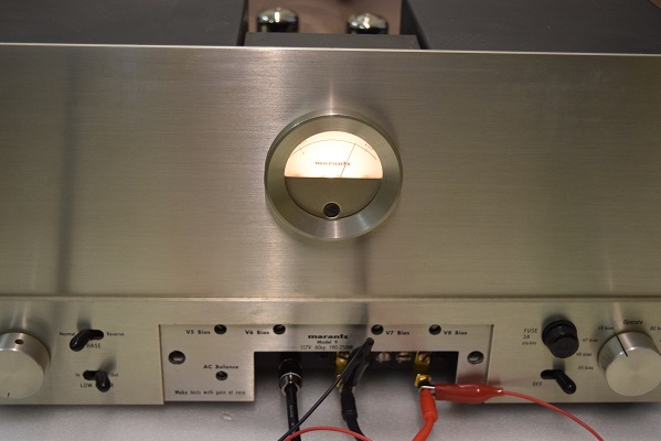 バイアス調整を行っていますがV8のみ設定ボリュームを最大に上げても針が正規の位置まで上がりません。真空管試験機では4本とも良好です。真空管をV5と取り替えるとV5のバイアス調整でも同じ状態です。このため内部回路の異常ではなく真空管固有の性格のようです。概ね既定の位置なのでこのままでも使用可能と考えます。