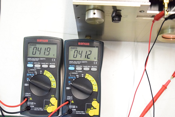 左テスターはバイアスC電圧です。 -41.9Vを示し良好です。右テスターは高圧B電圧です。412Vを示しこちらも良好です。