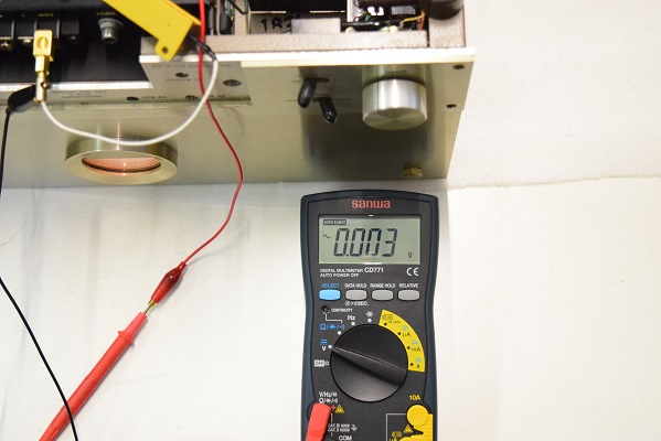出力端子の残留ノイズです。電源投入後10分経ったときの測定値です。0.003Vを示しノイズは皆無のようです。