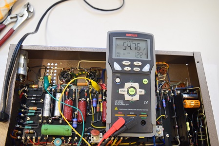 左テスターはバイアスC電圧です。 -41.1Vで良好です。中央のテスターは高圧B2です。381Vで良い値です。左の白いテスターは高圧B1です。こちらも426Vで良好です。
