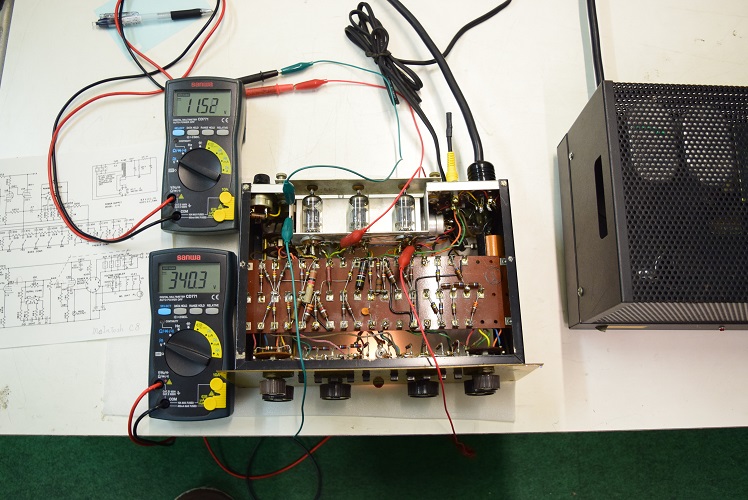 上のテスターはヒーター電圧です。11.56Vで良好です。下のテスターは高圧B1で338.5Vを示しこちらも良好です。