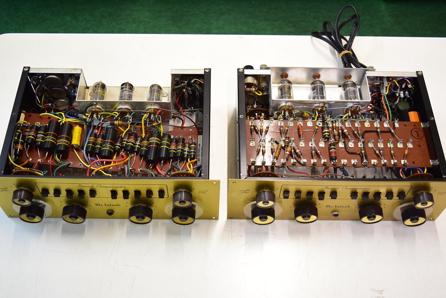 左は初期型のC-8で、ヒーターは交流点火です。右は当工房所有のものと同じ直流点火の後期型です。初期型の基板はC-4と同じくバンブルビーなど主なカップリングコンデンサーは上に配置してあります。後期型は基板の裏に配置しています。