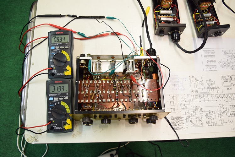 AC点火機の真空管です。イコライザー回路のV1,V2を新しいMullardから元のGEとSYLBANIAに交換しての試聴です。上に抜いたMullardを置いています。恐らくヒーター電圧がACで低くく動作させるため真空管自身が動作できないのでしょう。この電圧はAC点火として回路図通リ既定の電圧です。