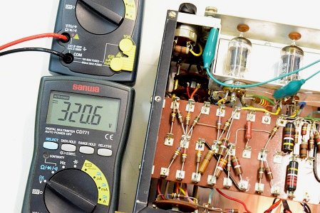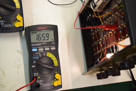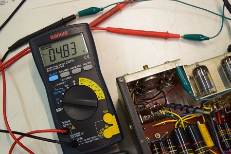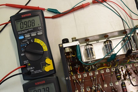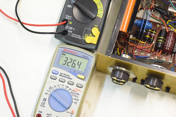 交流のヒーター電圧です。4.83Vで低い値です。本来電源トランスから出ているヒーター電圧はAC6.3Vですが、アンプ本体のヒーター回路に3オームの抵抗が入っているのでこれで電圧を落としています。