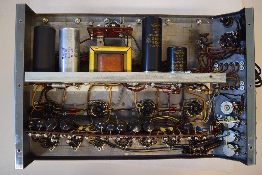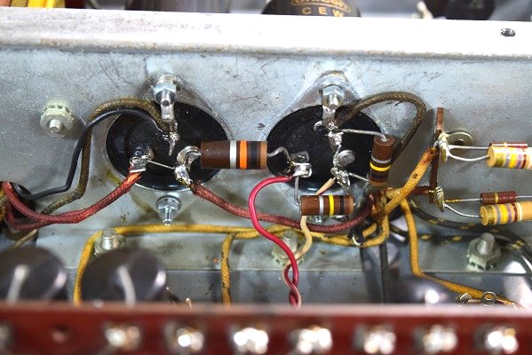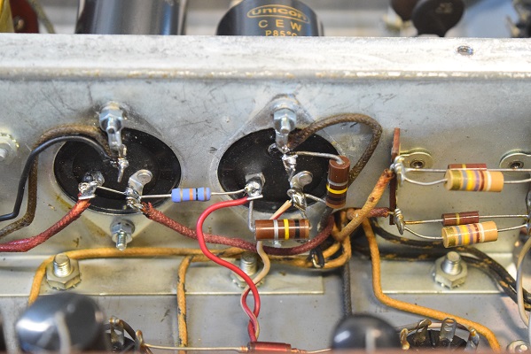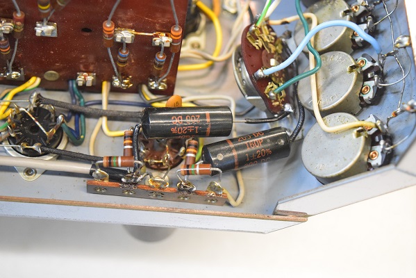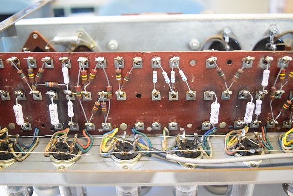 基板の裏の抵抗がかなり交換されています。レストアされた方はかなり几帳面の方のようです。特にユニティカップルの抵抗は純正A&Bではかなり値が変わるので、こちらでも値の揃ったものによく交換します。