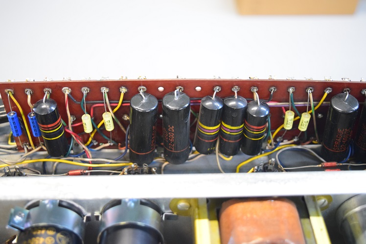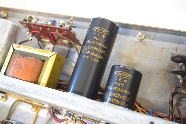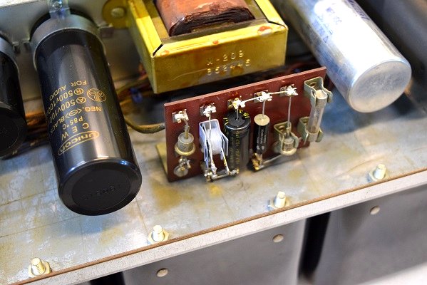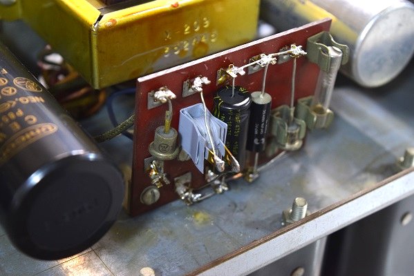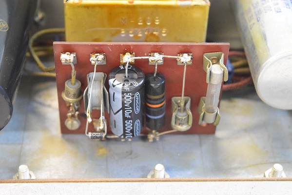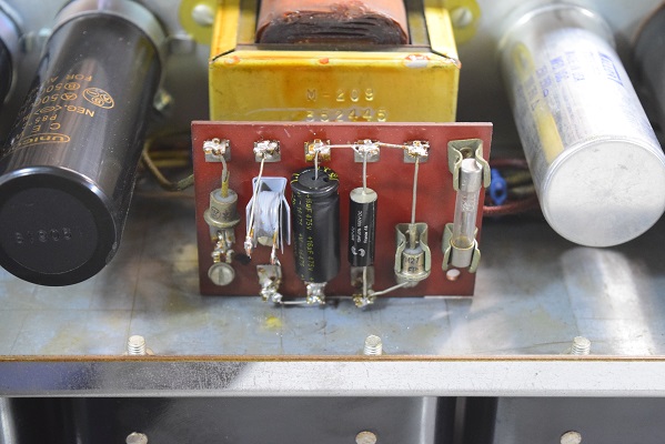 電源の高圧倍電圧の電解ブロックコンデンサーはマロリーに交換されています。小さなノイズフィルター用コンデンサーも交換されましたが耐圧が足りないようです。