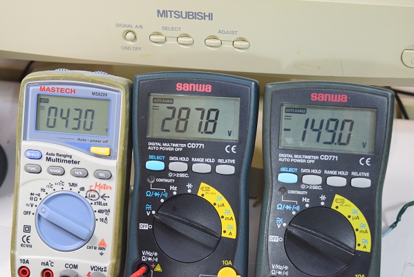 左の白いテスターは高圧B1です。430Vで良好です。中央は高圧B2です。287.8Vで良好です。右はバイアスC電圧です。-149.0Vで良好です。