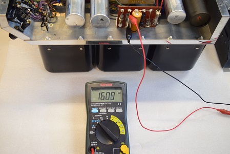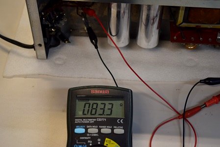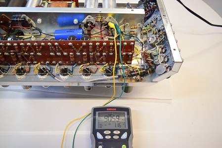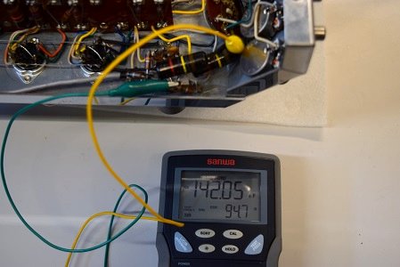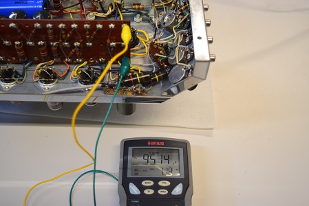 左の白いテスターは高圧B1です。何と、207.2Vで100V以上も低い値です。よく動いていたものです。ここまで低い状態で聴いていると球の寿命に影響が出ます。