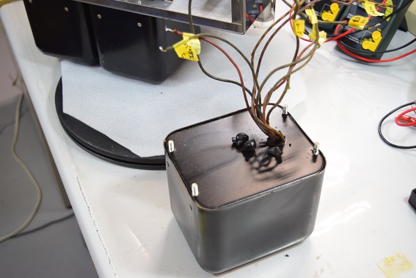 電源トランスを外した状態です。過熱で中からピッチが溶け出しています。