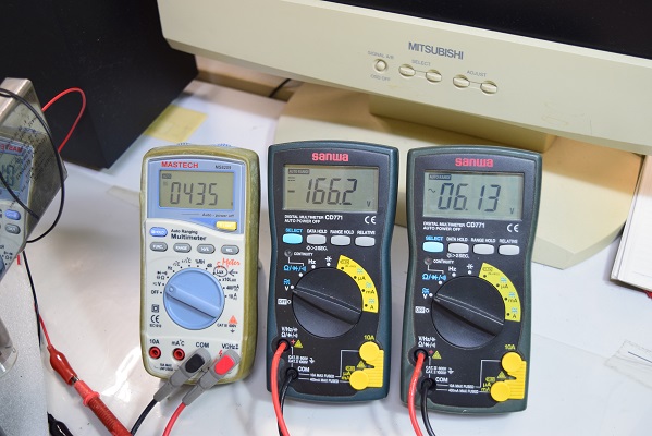 左白テスターは高圧B1です。435Vで規定通り良い値です。中央はバイアスC電圧です。-166.2Vで少し深いですが良い値です。右はヒーター電圧です。AC6.13Vで良好です。