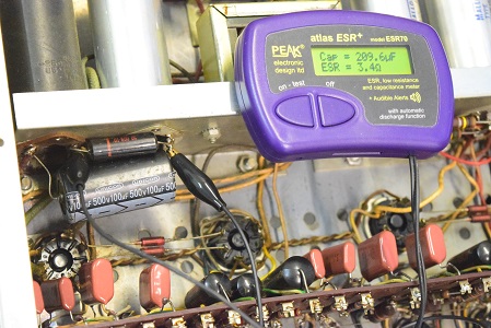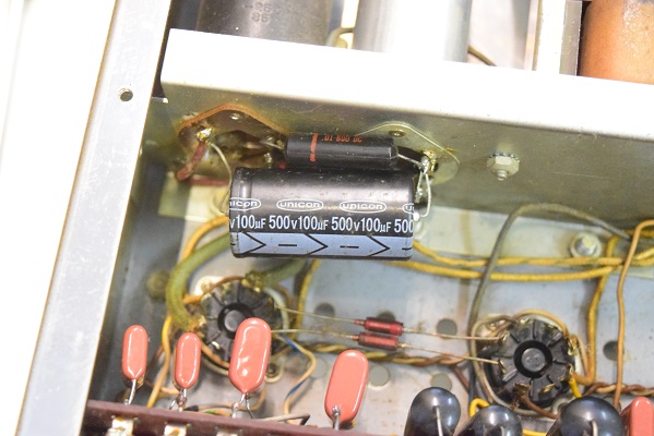初段管カソードバイパスコンです。違うタイプのものに交換されています。手抜きなのか配線を外さないで途中で繋いであります。