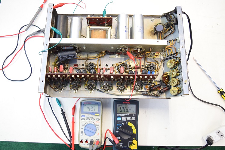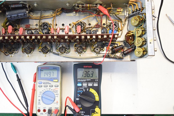 この画像の右のテスターは高圧B1,2の値です。432Vを示し良好です。左の白いテスターはバイアスC電圧です。-149.7Vを示し良好です。