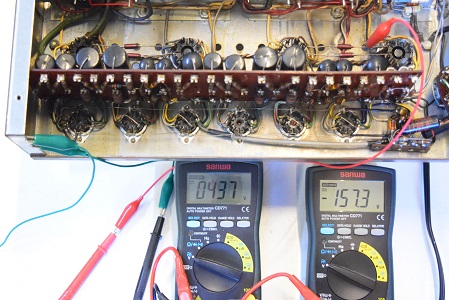 電源回路の部品を全て交換し、出力管も4本とも他の球を使って取り敢えず電源を入れてみました。