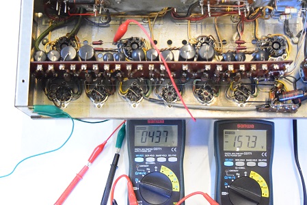 各出力管のプレート電圧は4本とも同じ437Vを示しバランスよく安定しています。