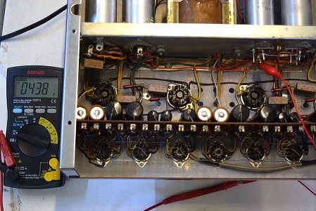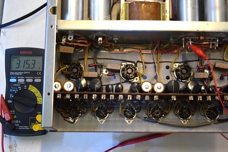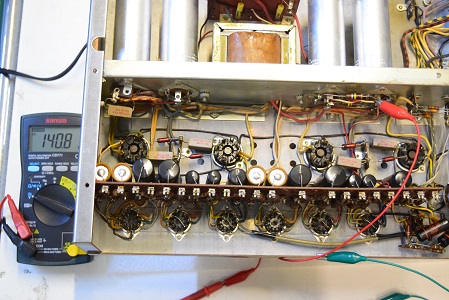 高圧B1です。438Vを示し充分な値です。レストア前より少し落ちていますが、以前は電圧を上げるために無理矢理改造されていました。