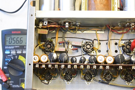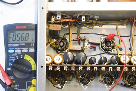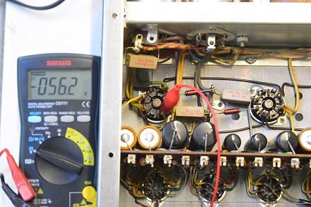 ← 左の出力管2本です。それぞれ-56.6Vと-57.1Vを示し概ね良好です。