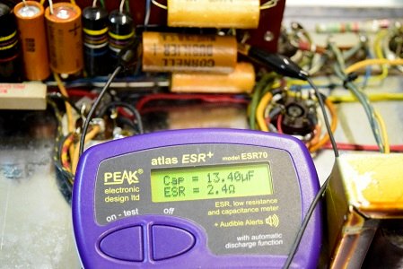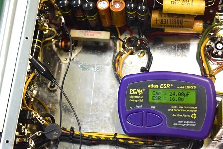 初段管のカソードバイパスコンです。容量が倍に膨らみESRも高い状態です。