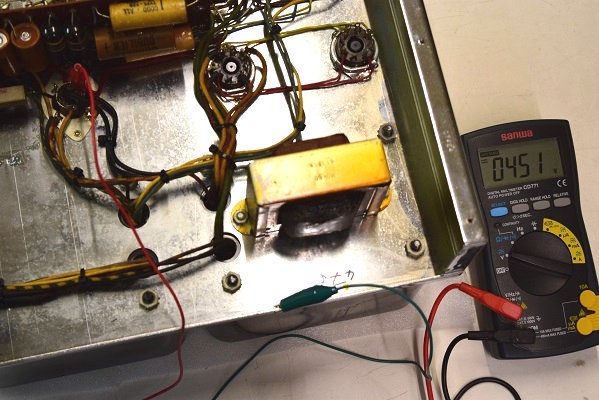 高圧B1です。451Vを示し良い値です。電圧は良いのですが電解ブロックコンデンサーが殆ど機能していないので恐らく電圧にリプルが乗って音にも影響が出ていると推測します。