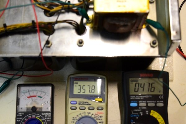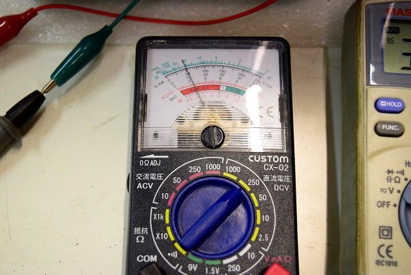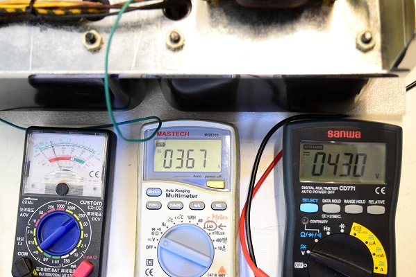 右のテスターは高圧B1です。430Vを示し良好です。中央のテスターは高圧B2です。367Vを示し良好です。
