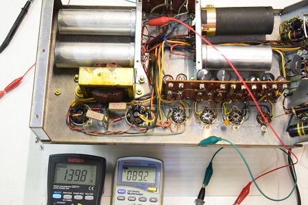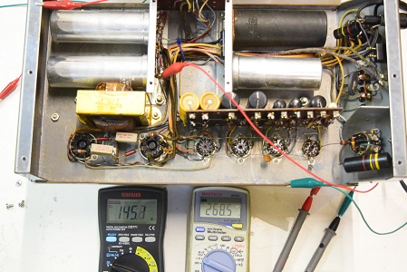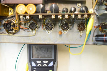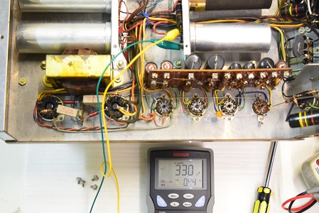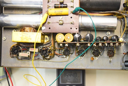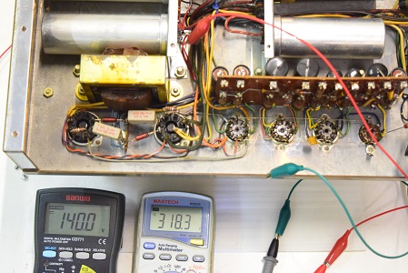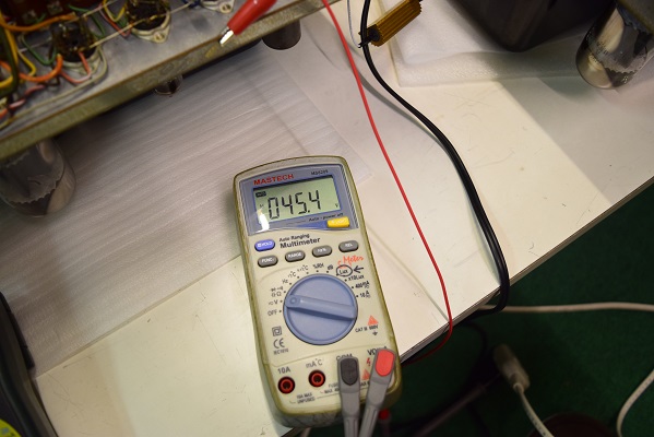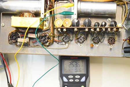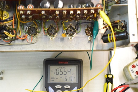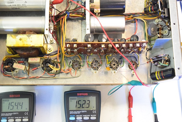 左テスターはバイアス電圧で-151.6Vを示し良好です。右テスターは高圧B1です。435Vを示し良好です。