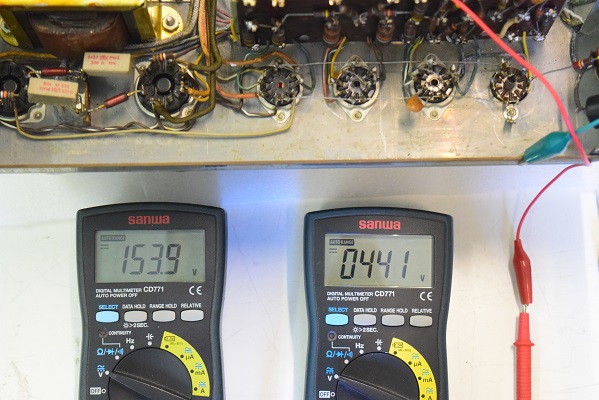 左テスターはバイアス電圧で-153.9Vを示し良好です。右テスターは高圧B1です。441Vを示し良好です。