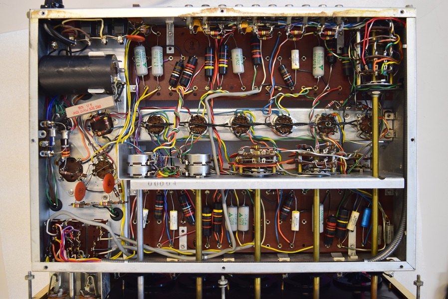 内部上面です。余り変化はありませんが電源の電解ブロックコンデンサーを2本交換し、背面のボリュームを2個交換しています。