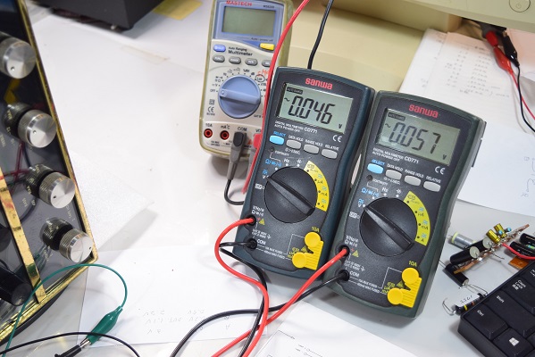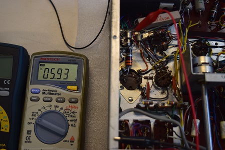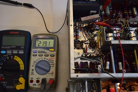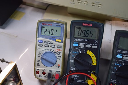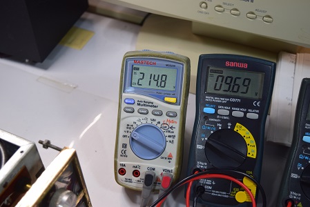 左の白いテスターは高圧B1です。249.1Vでとても良い値です。右テスターはヒーター電圧です。9.65Vで良い値です。