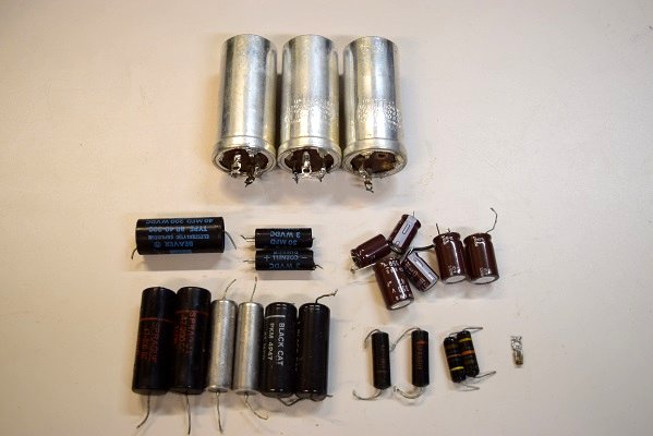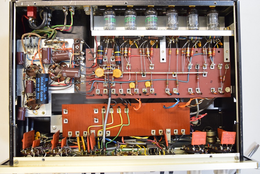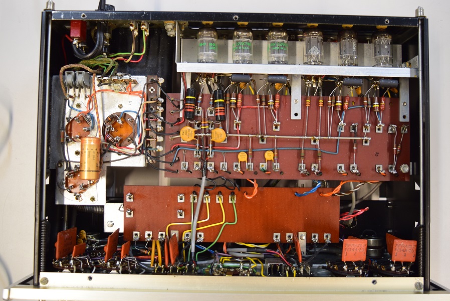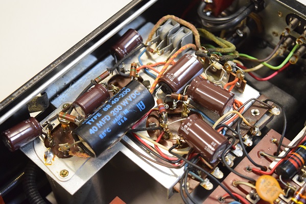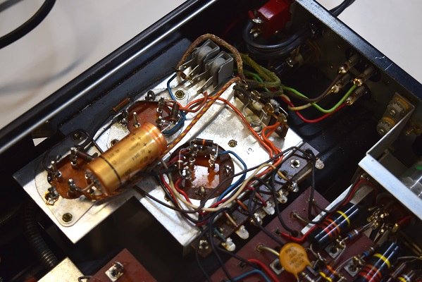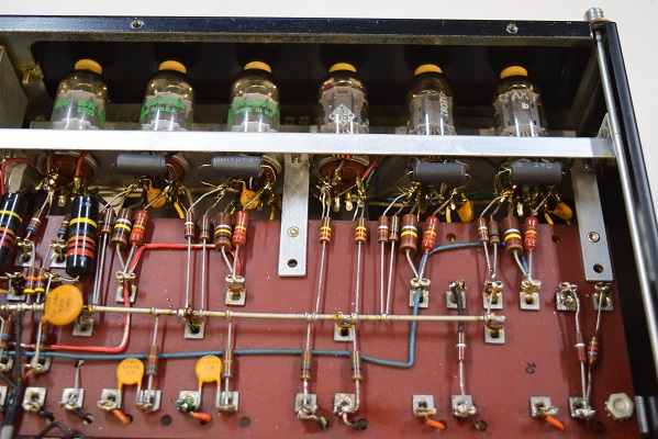 電源回路は以前他のレストア屋さんがご苦労されて抜けているブロックコンデンサーに市販の電解コンデンサーをパラに接続されました。しかし、電圧は確保されたものの抜けたブロックコンデンサーをそのまま使用されているのでこの影響から追加された電解コンデンサーの能力が発揮できず、少し脈流が乗った状態のB電圧が各回路に供給され、ノイズとなって音に乗ってきています。
