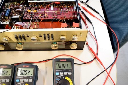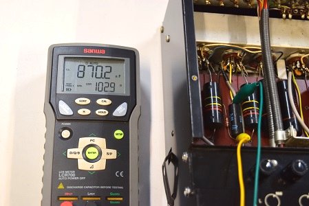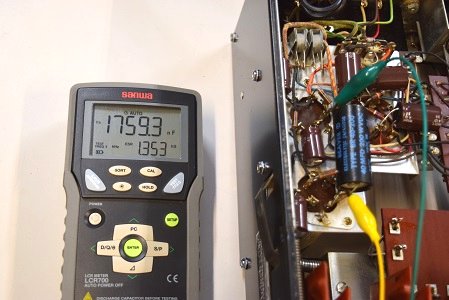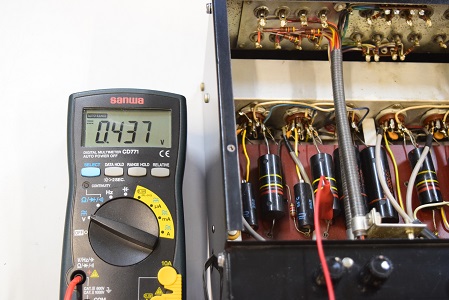 最初の検査でチェックしなかった最終段出力コンデンサー バンブルビー0.022uFの片側の足を外して単体チェックを行っています。左右ともOL表示で完全良品です。