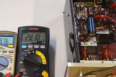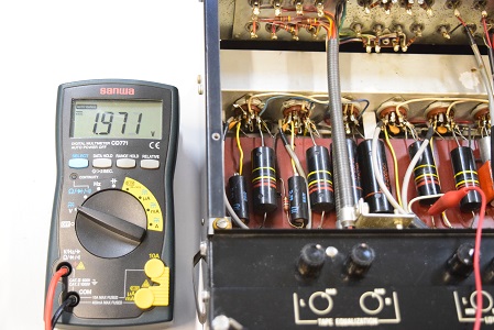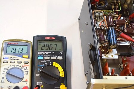 左の白テスターはヒーター電圧です。 19.73vで良好です。右テスターは高圧B1です。296.7Vで良好です。