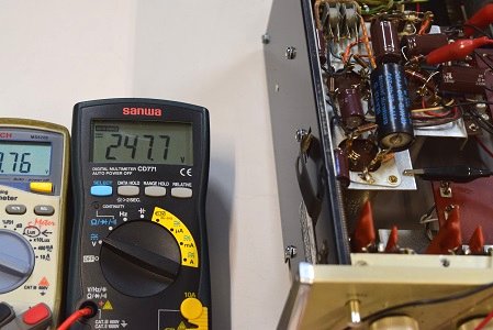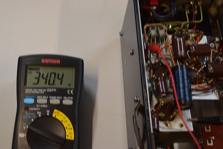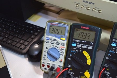 左の白テスターは高圧B1です。300.1Vで規定通りです。右テスターはヒーター電圧です。こちらも19.33Vで極めて良い値です。