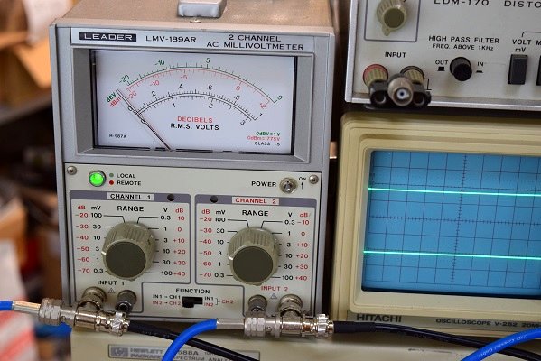 残留ノイズです。ミリバルのメーター読みで0.2mVと0.3mVを示しています。レストア前の1/20まで下がりました。オシロも最小レンジで波形の乱れはありません。