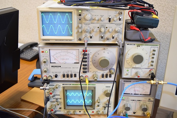 下のオシロは左右の入力波形で、上のオシロは左右の出力波形です。