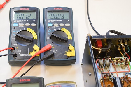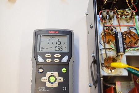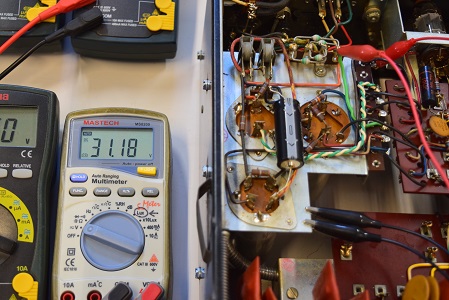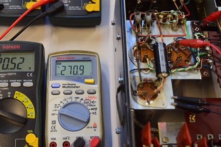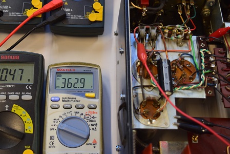 左テスターは高圧セレン直後です。347.8Vでやはり少し高いようです。中央のテスターは低圧ダイオード直後です。まあまあの値です。右テスターはヒーター電圧です。良い値です。